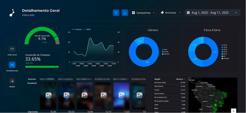 Visão geral, detalhamento, funil de tráfego, linha do tempo, imagem dos criativos, dados demográficos e muito mais.