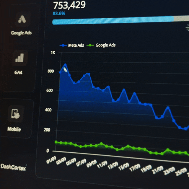 Os Relatórios DashCortex utilizam o Looker Studio, uma plataforma do Google. Toda a estrutura já está pronta, basta conectar suas contas de anúncios, analizar os resultados ou compartilhar com seu cliente.